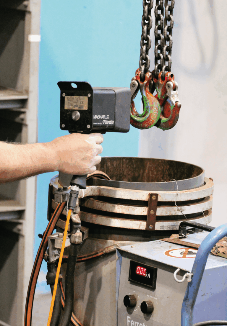 Durch ein Magnetfeld mit fluoreszierender Flüssigkeit und UV Beleuchtung werden kleinste Risse sichtbar gemacht und von unseren Prüftechnikern zuverlässig erkannt.