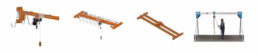 Säulenschwenkkrane, Wandschwenkkrane, Hängebahnsysteme, Brückenkrane, Werkstattkrane, Laufkrane, E-Kettenzüge, E-Seilzüge