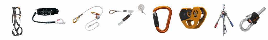 Auffanggurte, Verbindungsmittel, Höhensicherungsgeräte (HSG), Rettungshubgeräte, Abseilgeräte, permanente Systeme gegen Absturz