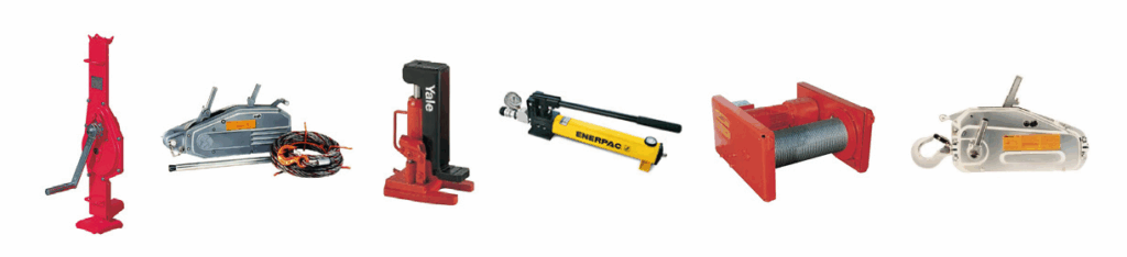 Ratschzüge, Stirnradkettenzüge, Seilzüge, Seilwinden, Laufkatzen, Greifzüge, Zahnstangenwinden, Hebegeräte, Maschinenheber